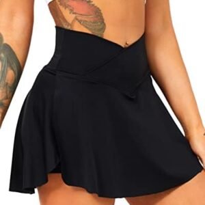 [Crossover Pleated Athletic Skirt]–This high waisted sports skorts skirts for women designed with trendy v cut elastic wide elastic waistband to accentuates your waistline and hips, high rise fit for tummy control, no rolling down