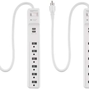 Amazon Basics 6-Outlet Surge Protector Power Strip, 2 USB Ports, 2 Ft Cord – 500 Joule, White, 2-Pack