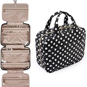 Special Design – Inner pockets with elastic straps hold bottles upright. Two side pockets of travel toiletry bag can keep the wet/dry items separated. The right side pocket with PVC material is easy to clean and dry, perfect for makeup brushes, toothbrushes, wet towels. Stow-away 360 degree swivel non-slip metal hook for versatile hanging options.Can be gifts for Women on Black Friday,Cyber Monday,Christmas day.