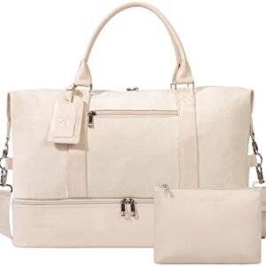 【Large Capacity Weekend Bag】Women’s weekend travel bag measures 20″L x 16″H x 9″W , Great for weekend plane trips,Adjustable wide shoulder straps, can be used as a handbag, enough to hold all travel essentials 3-5 days change of clothes, wallet, cell phone, makeup, cosmetic bag, etc. The small rear pocket can be slid over the handle of the suitcase, freeing hands and reducing the burden.