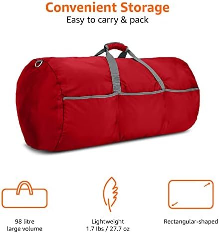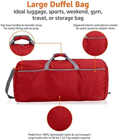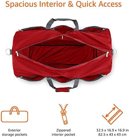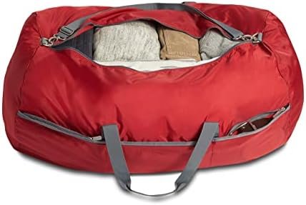 Red, large rectangular-shaped duffel bag with roomy interior (over 6,000+ cubic inches); ideal for travel or storage
