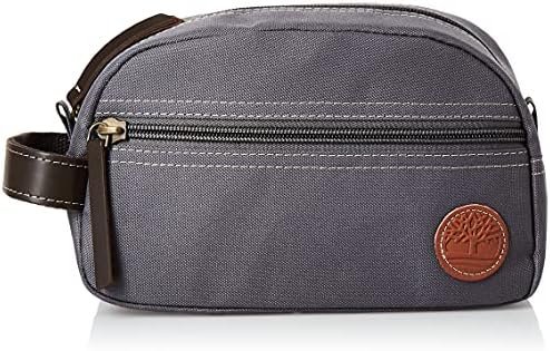 The timberland canvas travel kit features genuine leather trim, an exterior zipper pocket and carrying handle.