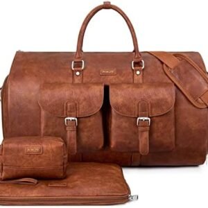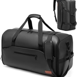 WATERPROOF SHOES POUCH – This garment duffel bag work perfect as a 56L duffel bag/travel weekender bag after assembled. The left side pocket of this leather garment bag is a waterproof PVC lined shoes pouch can hold up to 2 pairs shoes, wet/dirty clothes, wash bags or other things you want to store separately, keep other things in weekend bag clean and tidy. The right side pocket is designed for passport, keys and some other small items. Extra front 2 pockets for quick access.